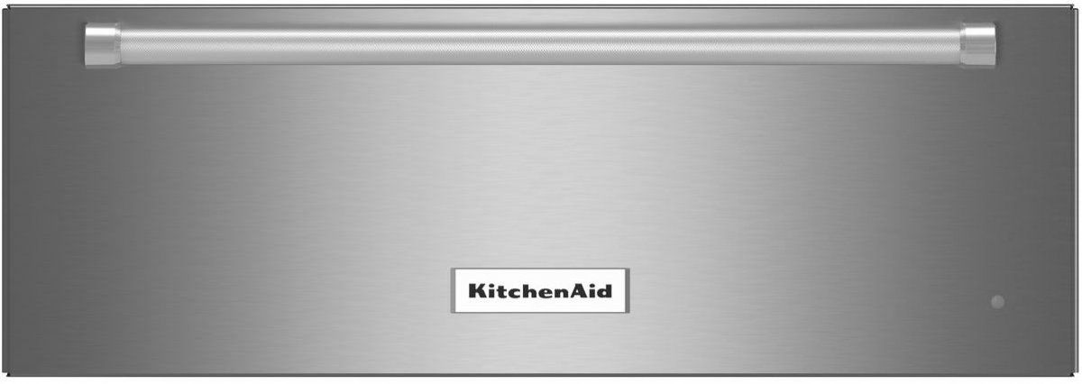 A bold blend of professionally-inspired styling and sleek touches for the home. The striking built-in warming drawer features Satin Textured Handles with iconic KitchenAid Brand Medallions.