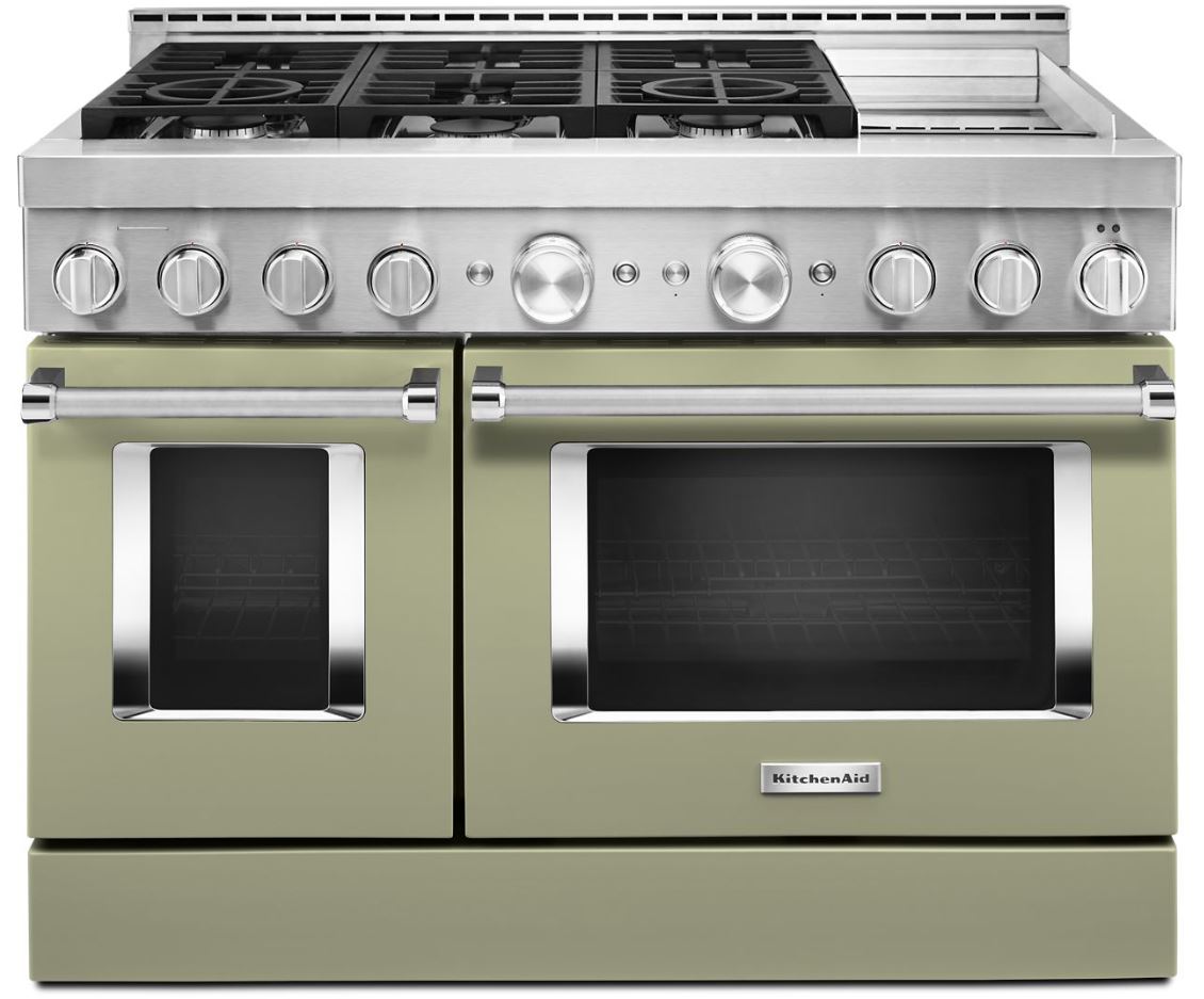 Satisfy your craving to create with a 48-inch KitchenAid® Commercial-Style Range with Even-Heat™ Chrome Electric Griddle. This 6-burner gas range features two versatile 20,000 BTU Ultra Power™ Dual-Flame Burners with the power and precision to successfully sear, simmer, stir-fry and saute´. The double oven with Even-Heat™ True Convection helps you achieve more consistent baking and roasting.Read More