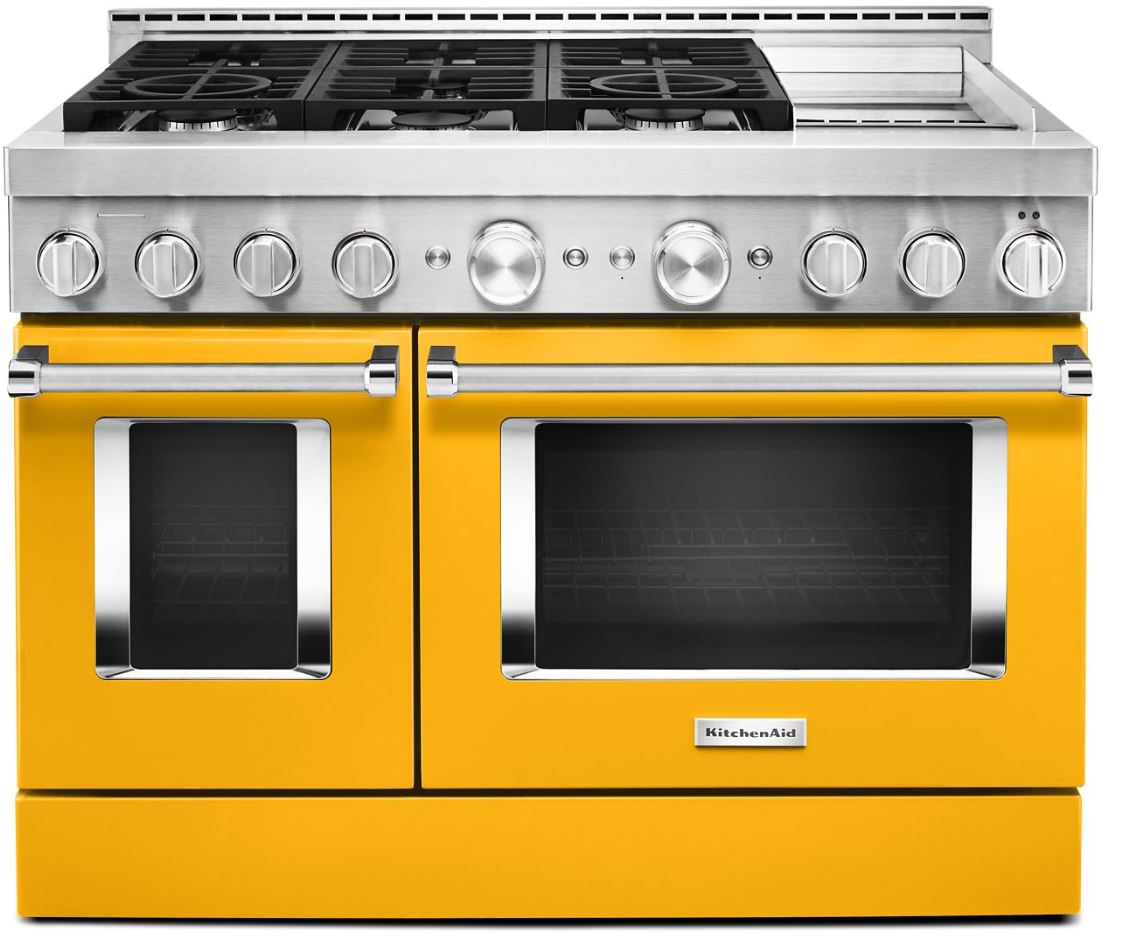Satisfy your craving to create with a 48-inch KitchenAid® Commercial-Style Range with Even-Heat™ Chrome Electric Griddle. This 6-burner gas range features two versatile 20,000 BTU Ultra Power™ Dual-Flame Burners with the power and precision to successfully sear, simmer, stir-fry and saute´. The double oven with Even-Heat™ True Convection helps you achieve more consistent baking and roasting.Read More