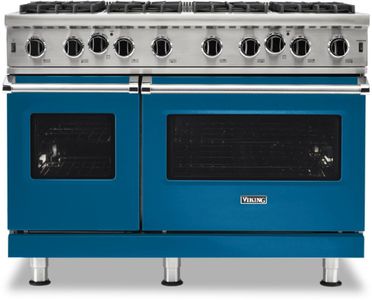 Viking® 5 Series 48" Alluvial Blue Freestanding Gas Range features a VariSimmer™ Setting, Commercial Type Stainless Steel Open Burners, a SureSpark™ Ignition System, a Gourmet-Glo™ Gas Infrared Broiler, and ProFlow™ Convection Baffle.Read More