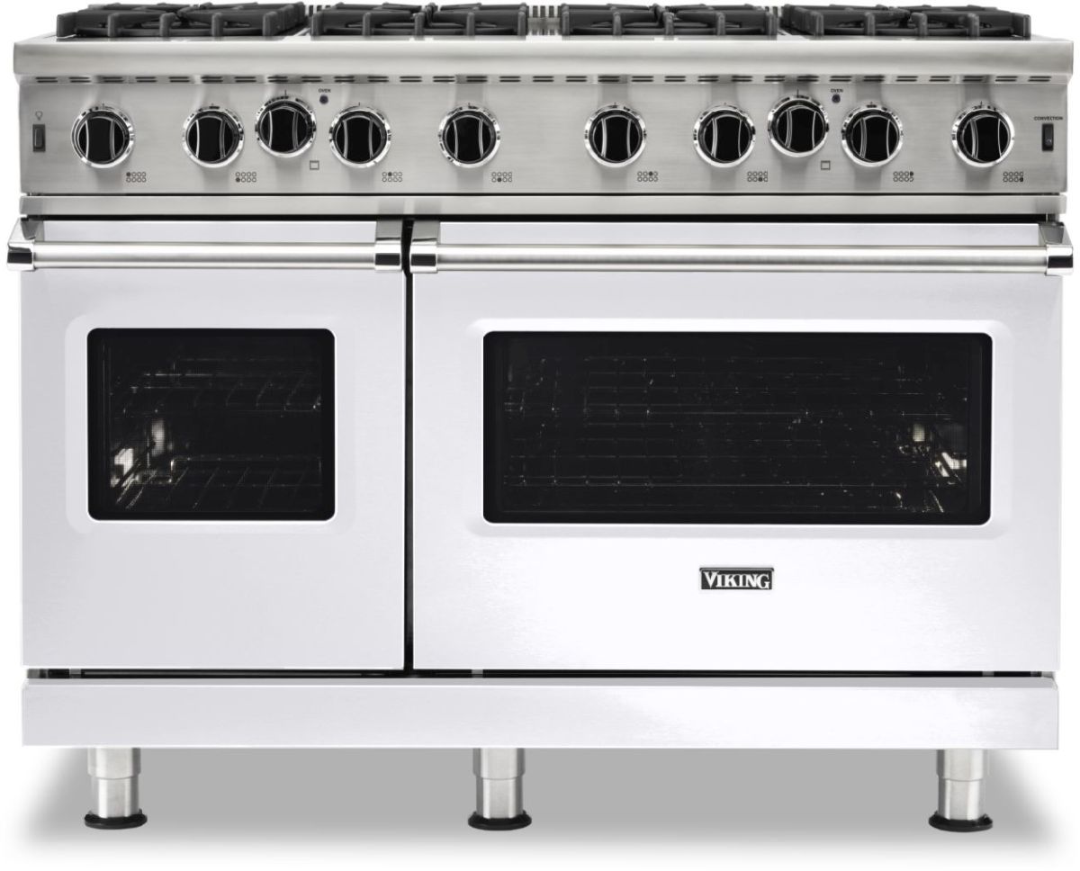 Viking® 5 Series 48" White Freestanding Gas Range features a VariSimmer™ Setting, Commercial Type Stainless Steel Open Burners, a SureSpark™ Ignition System, a Gourmet-Glo™ Gas Infrared Broiler, and ProFlow™ Convection Baffle.Read More